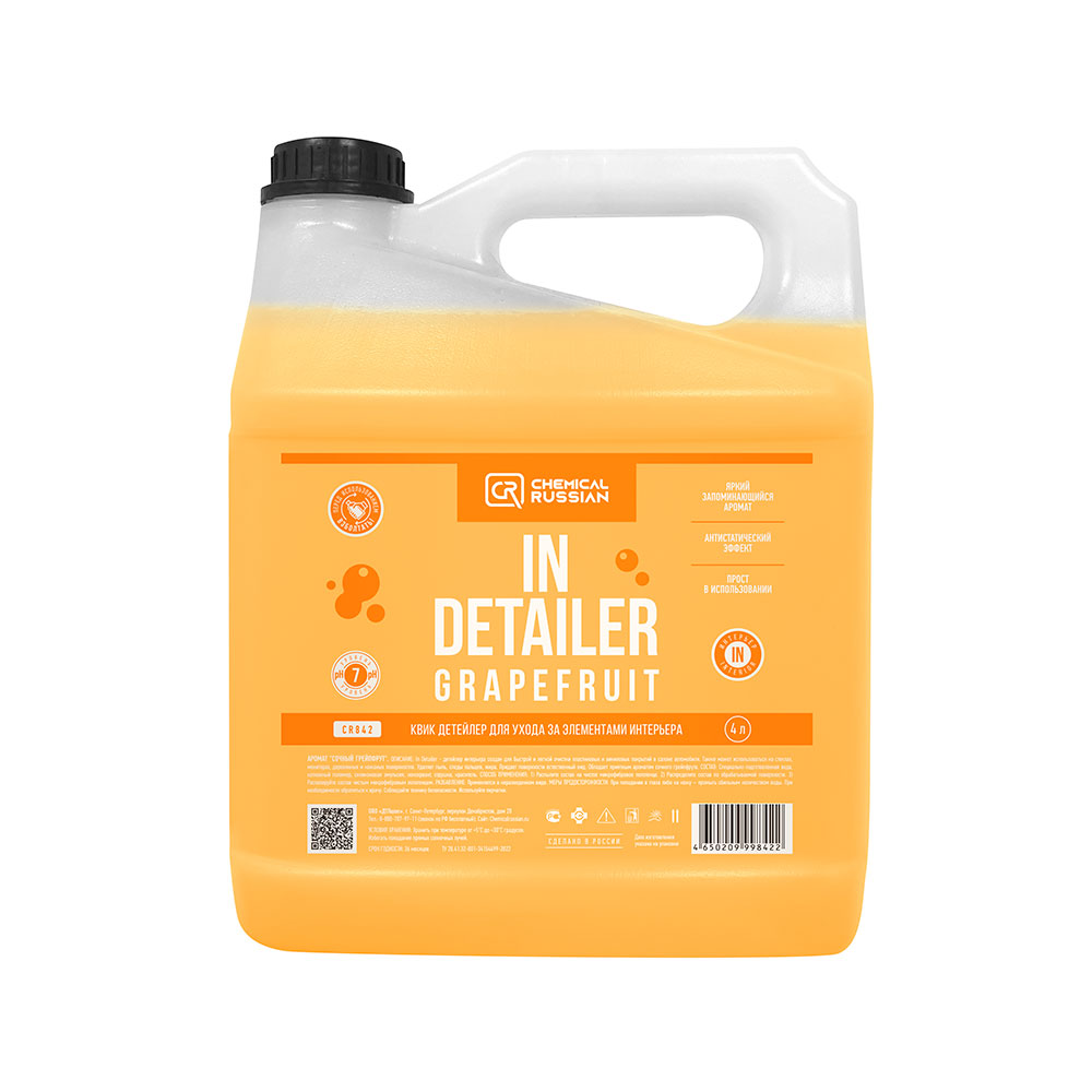 Chemical Russian IN Detailer GRAPEFRUIT предназначен для эффективного ухода за интерьером автомобиля. Он помогает поддерживать чистоту и свежесть салона, легко удаляя загрязнения и придавая поверхностям ухоженный вид. Незаменим для владельцев автомобилей, которые хотят сохранить первозданный вид салона и наслаждаться приятным ароматом во время поездки.