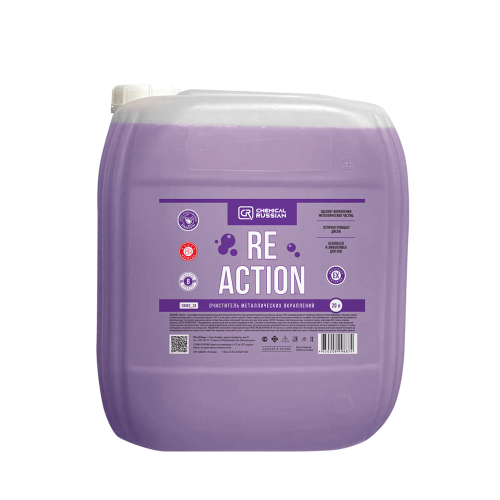ReAction — это высокоэффективный профессиональный бескислотный очиститель металлических вкраплений, созданный для колесных дисков и лакокрасочного покрытия (ЛКП). Его сбалансированная рН-нейтральная формула безопасно и эффективно удаляет металлические вкрапления не только с легкосплавных дисков и ЛКП, но также с хрома, стекла и пластика. ReAction идеально подходит для глубокой очистки автомобиля перед полировкой. При взаимодействии с загрязнениями состав окрашивается в фиолетовый цвет, что служит индикатором его работы. Безопасен для всех типов дисков.