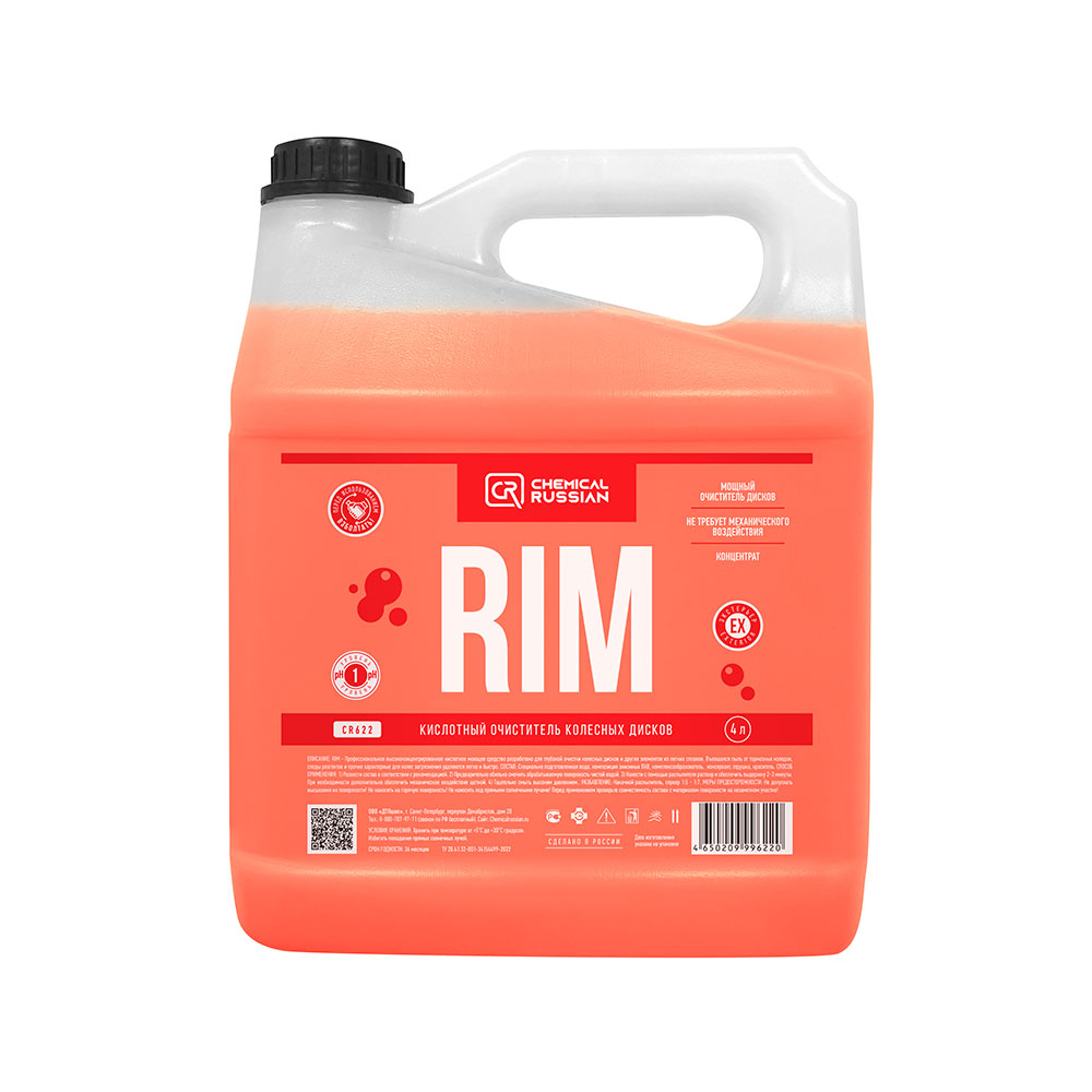 Chemical Russian RIM — это профессиональное высококонцентрированное кислотное моющее средство, специально разработанное для глубокой очистки колесных дисков и других элементов из легких сплавов. Забудьте о въевшейся пыли от тормозных колодок, следах реагентов и других характерных для колес загрязнениях. С этим средством удаление сложных загрязнений становится легким и быстрым процессом.